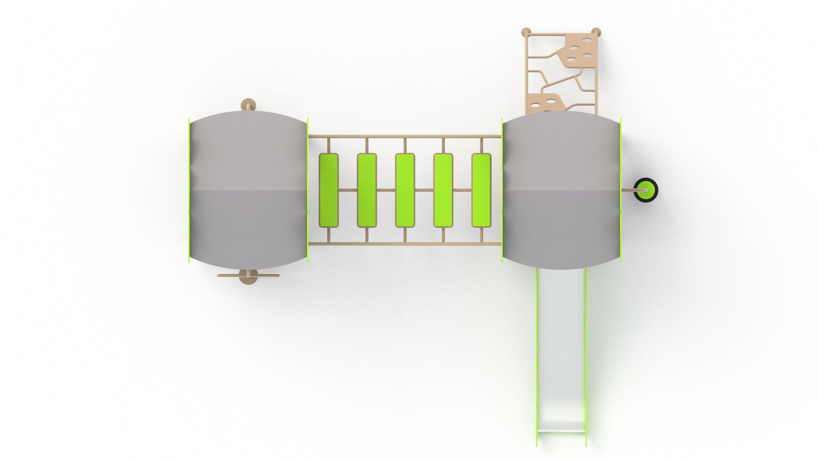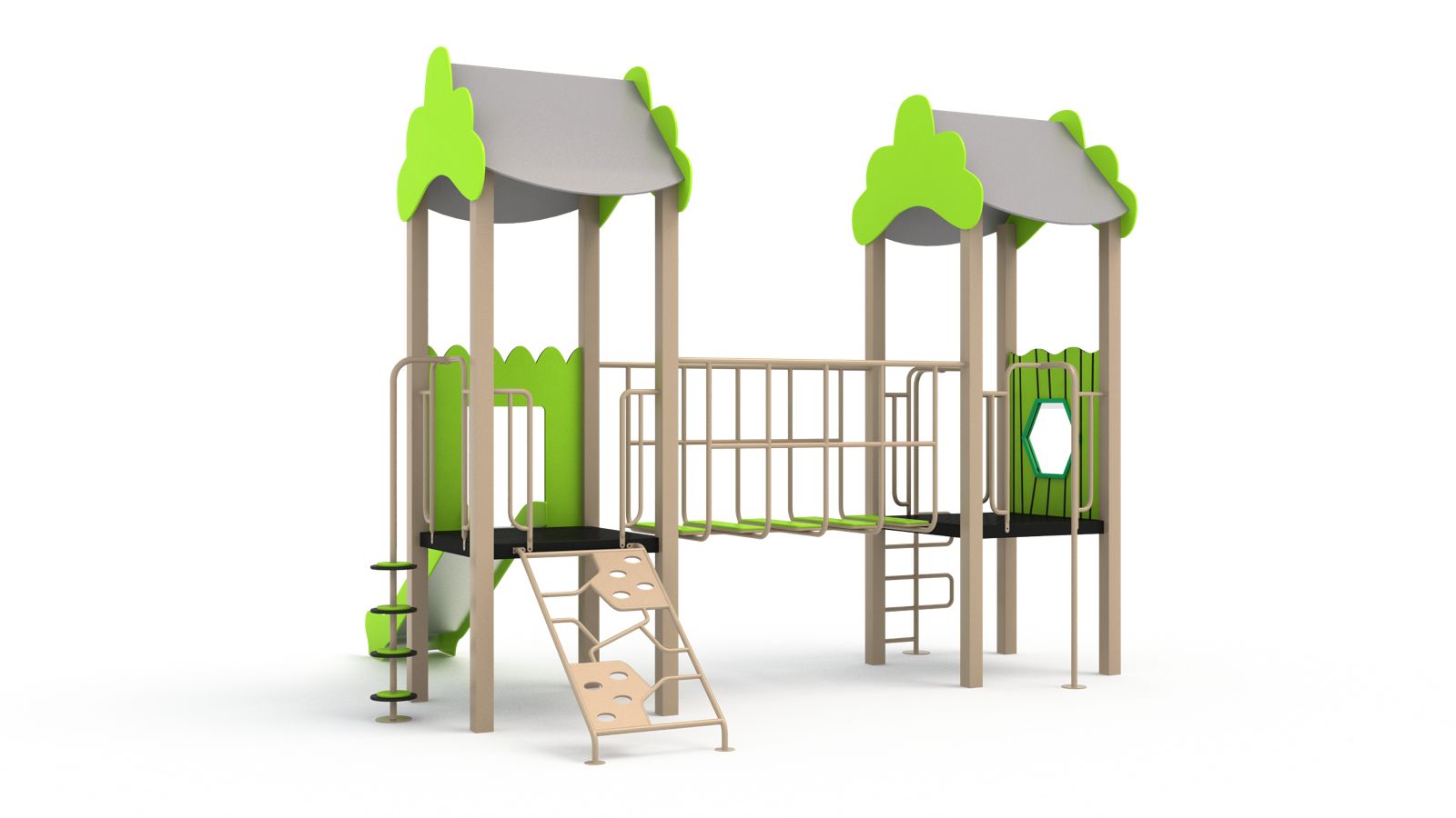 Este conjunto de juego está formado por dos plataformas, una de ellas cubierta, conectadas mediante un puente que invita a la exploración y el equilibrio. La segunda plataforma incorpora un tobogán y una zona de escalada que estimula la actividad física y la coordinación motora. Su diseño estructural, resistente y seguro, ofrece una experiencia de juego completa que combina diversión, movimiento y desarrollo en un entorno atractivo y funcional.